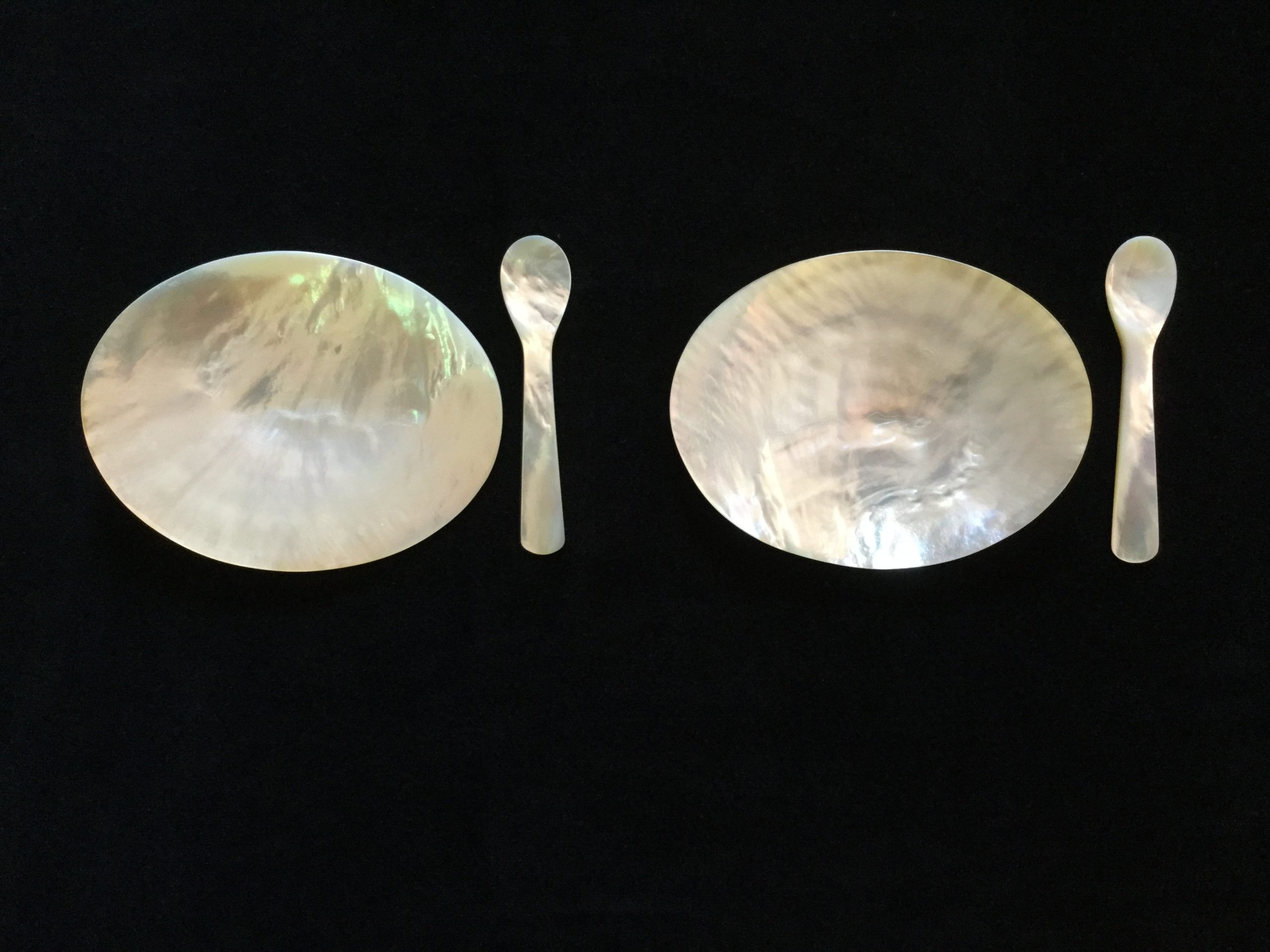 Juego de 2 platos forma óvalo de nácar con 2 cucharas.