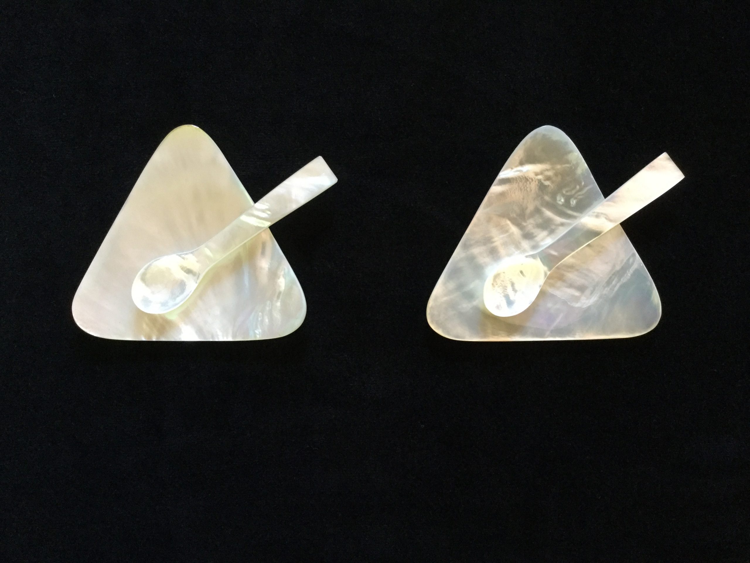 Juego de 2 platos triangulares de nácar con 2 cucharas.