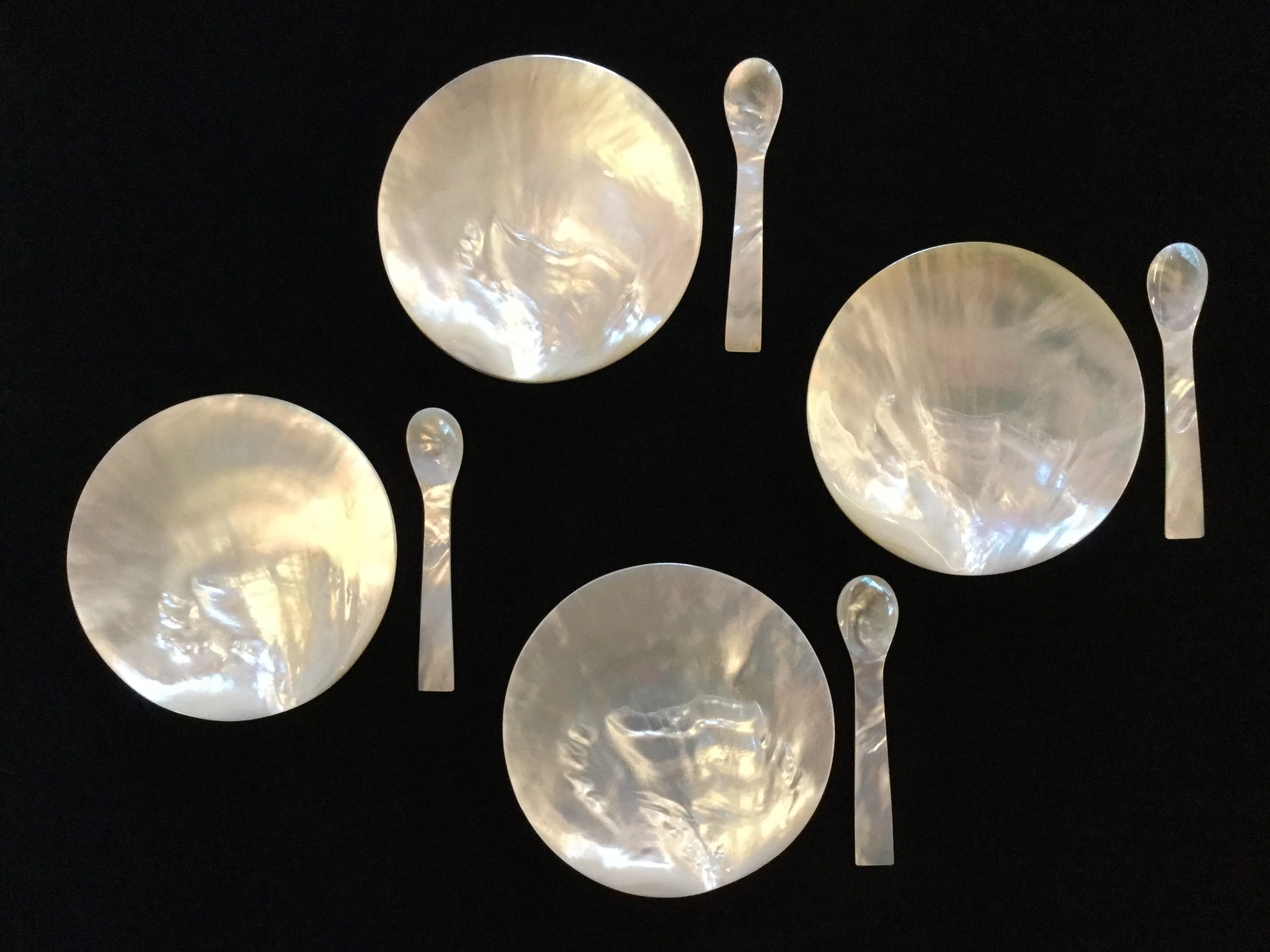 Juego de 4 platos redondos de nácar con 4 cucharas.